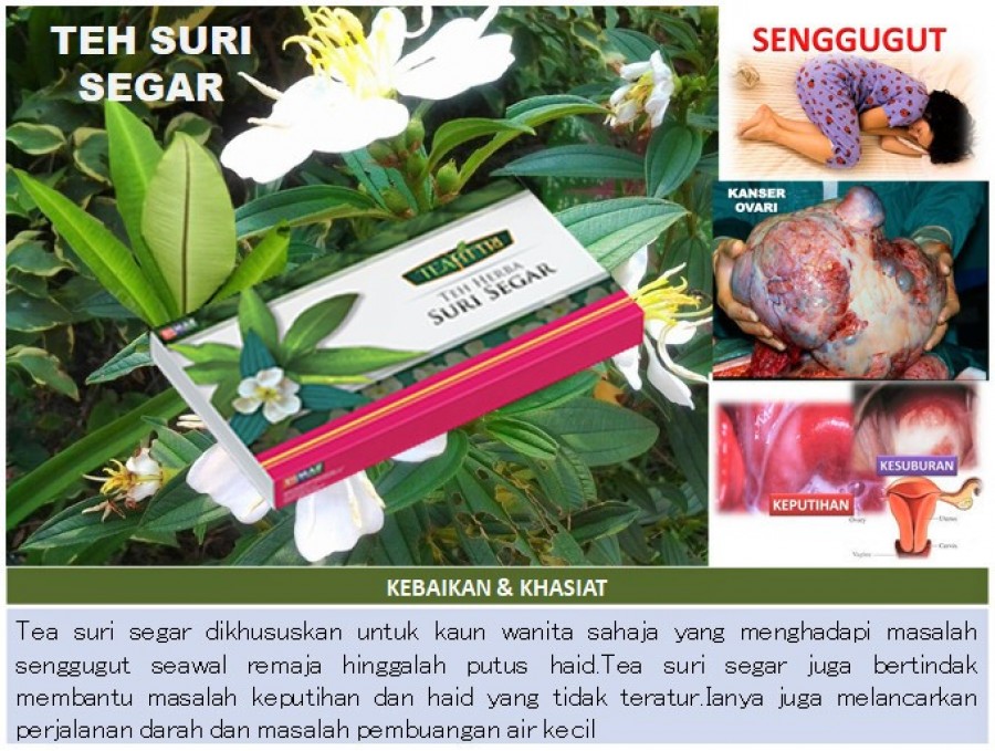 Kandungan bahan aktif yang terdapat di dalam Tea Suri Segar ialah Kacip Fatimah Nama saintifik nya ialah Labisia pumila.. Kacip fatimah dipercayai berkhasiat untuk memelihara kesihatan dalaman wanita, memelihara paras rupa dan membetulkan kitaran haid dan mengurangkan senggugut dan keputihan. Khasiat pada kacip Fatimah boleh mengembalikan tenaga selepas bersalin, mengurangkan masalah kesakitan dan mengurangkan kesan menopaus atau putus haid. Kacip Fatimah juga dianggap boleh merawat angin dalam perut, penyakit buasir dan penyakit kelamin. Pengaruh tinggi yang ada pada kacip Fatimah juga dianggap boleh menjadikam wanita awet muda hingga mampu mencegah penuaan. Daun dan pucuk senduduk secara tradisinya dimakan untuk memulihkan cirit-birit,berak berdarah dan keputihan serta mencegah parut-parut luka.Air rebusan akarnya digunakan untuk melegakan sakit gigi, melembutkan kaki dan mengurangkan kembung perut. Manakala air rebusan daun dan akar diminum untuk rawatan selepas bersalin. Air rebusan campuran daun-daun senduduk, cuka, halia bara (Zingiber officinale) dan bonglai (Zingiber cassumnar)digunakan untuk rawatan leucorrhea.