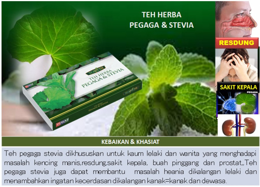 Kajian yang telah dibuat mendapati pegaga dan stevia dikhususkan untuk membantu kaum lelaki dan wanita yang menghadapi masalah kencing manis, resdung, sakit kepala, buah pinggang dan prostat. Teh pegaga stevia juga dapat membantu masalah heania dikalangan lelaki dan menambahkan ingatan kecerdasan dikalangan kanak-kanak dan dewasa.